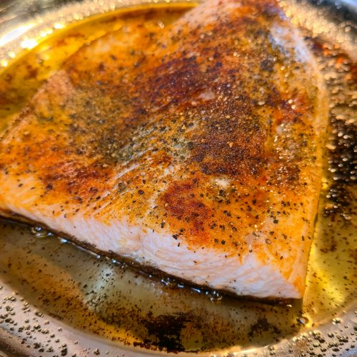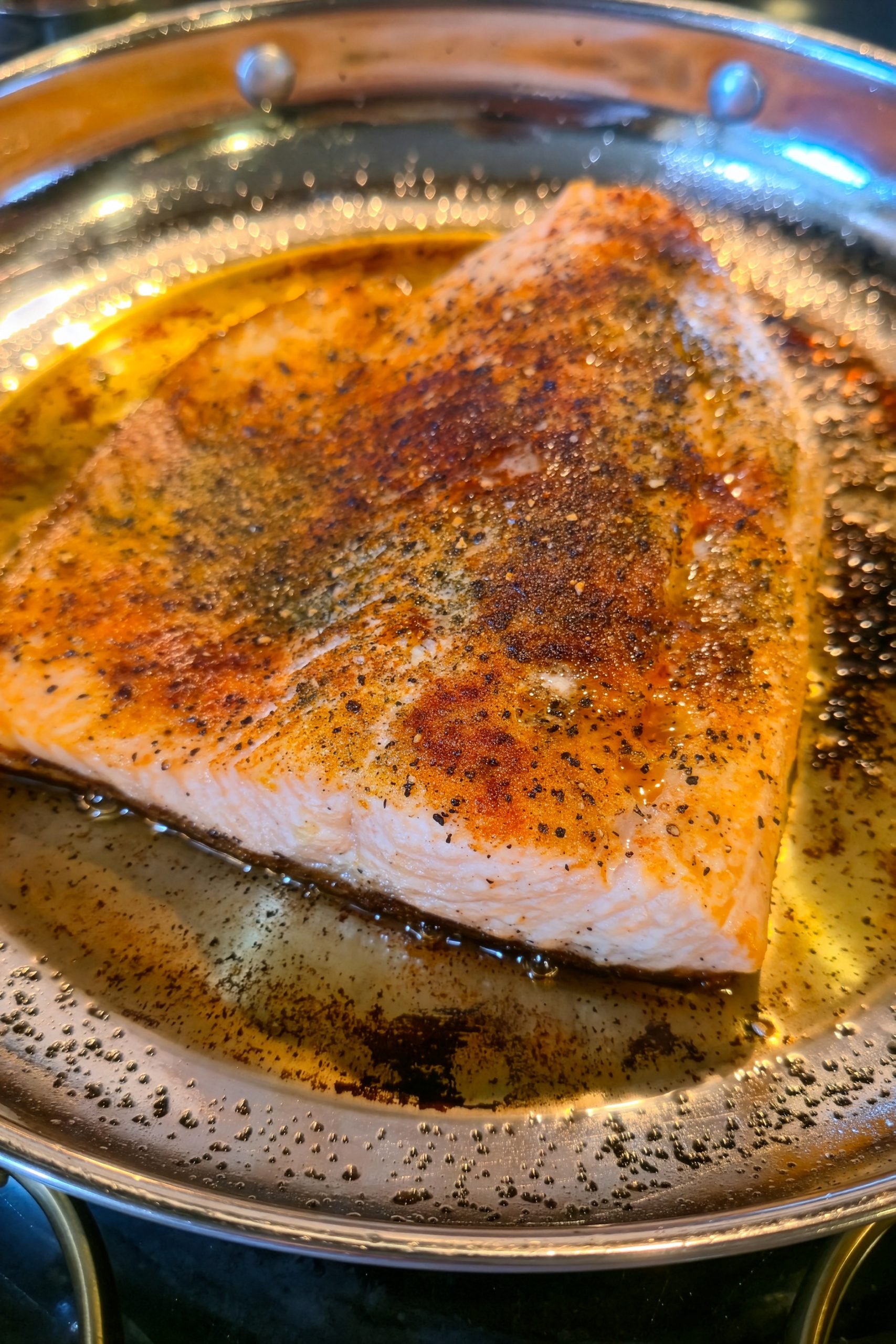 Pan-seared salmon is one of those dinners that feels special without a lot of effort. Cooking a whole fillet in a single pan gives you skin that’s golden and crisp, while the inside stays tender and flaky. A sprinkle of paprika adds a touch of smoky warmth, and a bit of butter and garlic makes every bite rich and flavorful. It’s the kind of dinner that looks like you spent hours in the kitchen, but really, it comes together in no time.